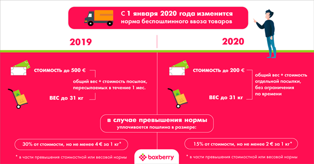 Сейчас (до конца декабря 2019 года) при расчете пошлин учитывается общий вес и стоимость посылок, пересылаемых в адрес одного физического лица в течение одного месяца. Лимит не должен превышать 500 евро и 31 кг.