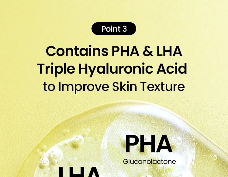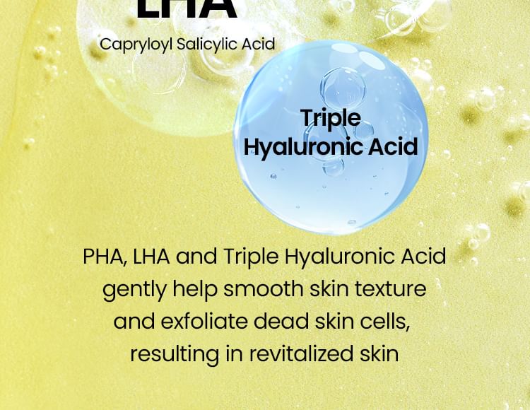 Enriched with PHA, LHA and three types of Hyaluronic Acid to gently remove dead skin cells and refine skin texture.