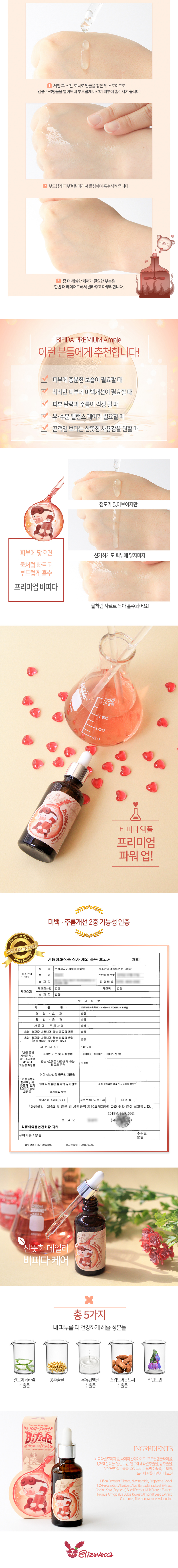 Состав: Фильтрат ферментированных бифидобактерий, Ниацинамид, Пропиленгликоль, 1,2-Гександиол, Аллантоин, Экстракт листьев Алоэ Барбадениса, Экстракт семян соевых бобов, Экстракт молочного белка, Экстракт семян сладкого миндаля, Карбомер, Триетанодамин, Аденозин