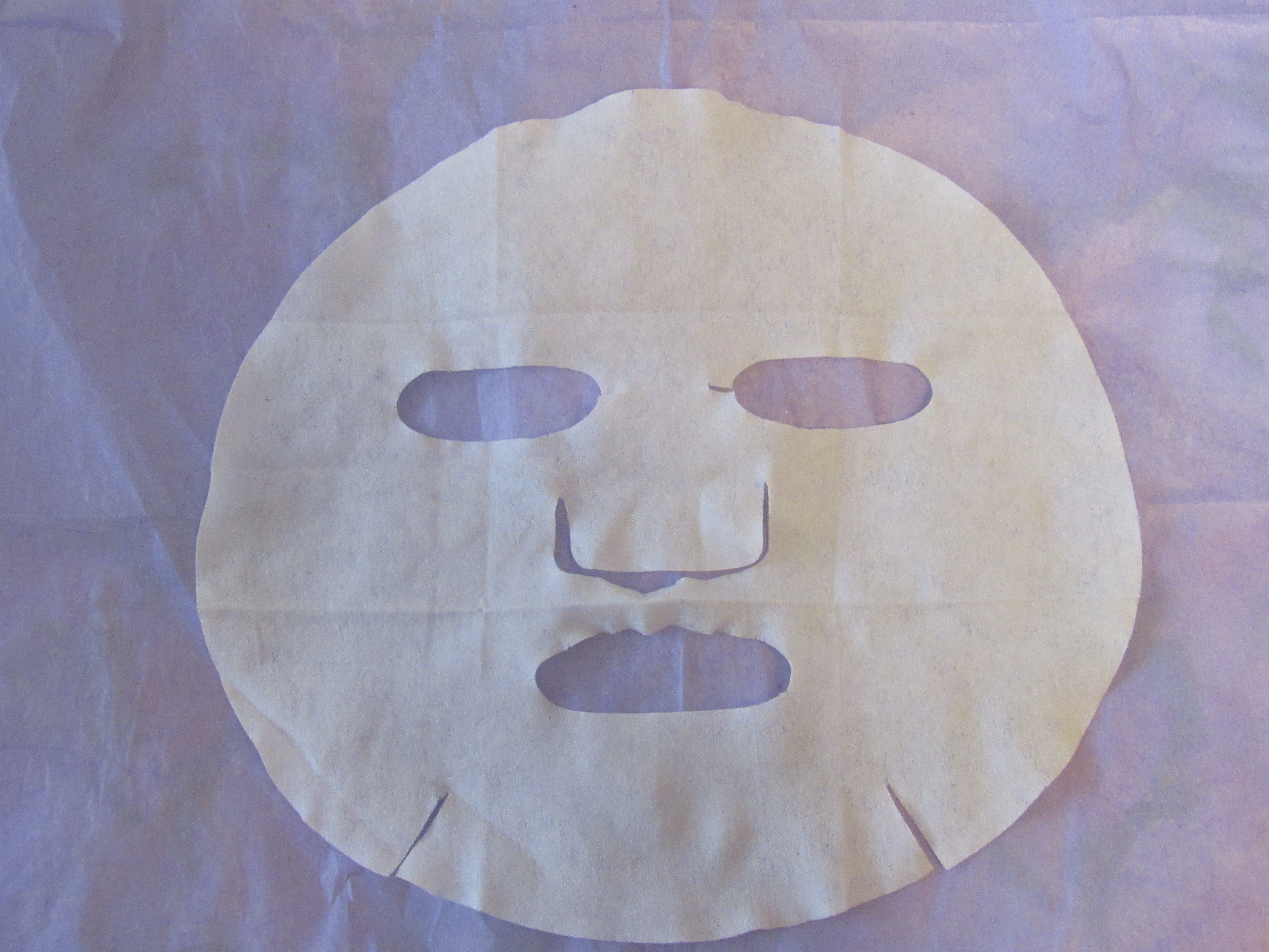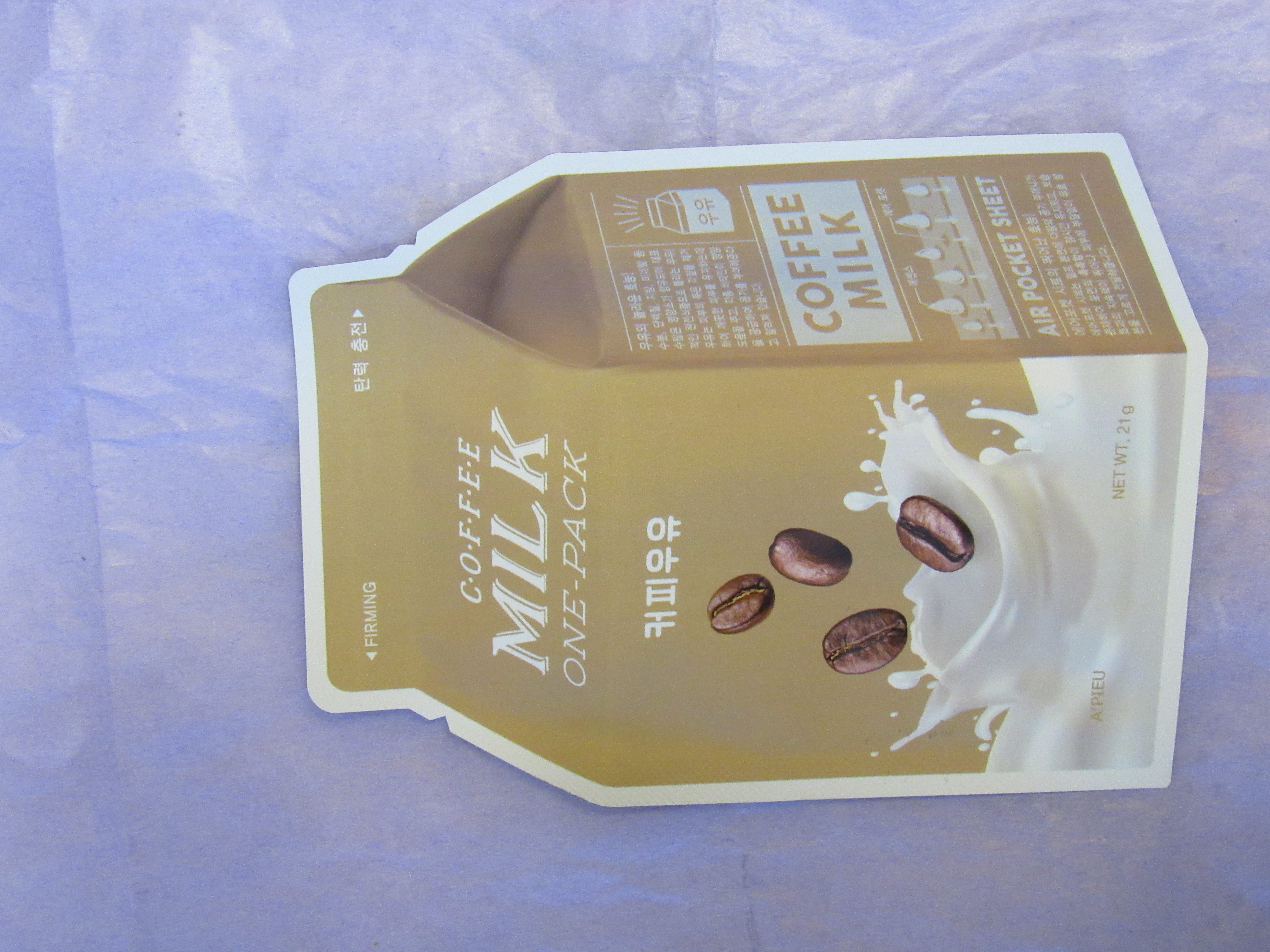 tan…@ Firming mask. The form of the mask is comfortable, the cutouts for the eyes are large. The mask is tightly attached to the face, it remains moist for a long time. The essence is white, it smells of coconut milk with coffee. Sticky.