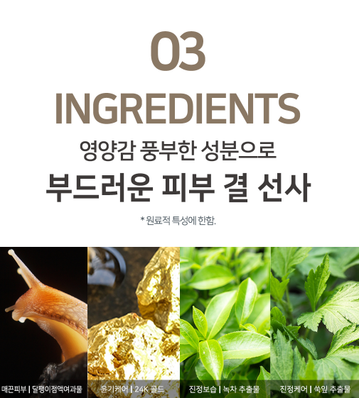 Вода, экстракт улитки, золото (0,0001%), экстракт шлемника байкальского, экстракт зеленого чая,экстракт гуттуиния, экстракт полыни обыкновенной, экстракт юдзу