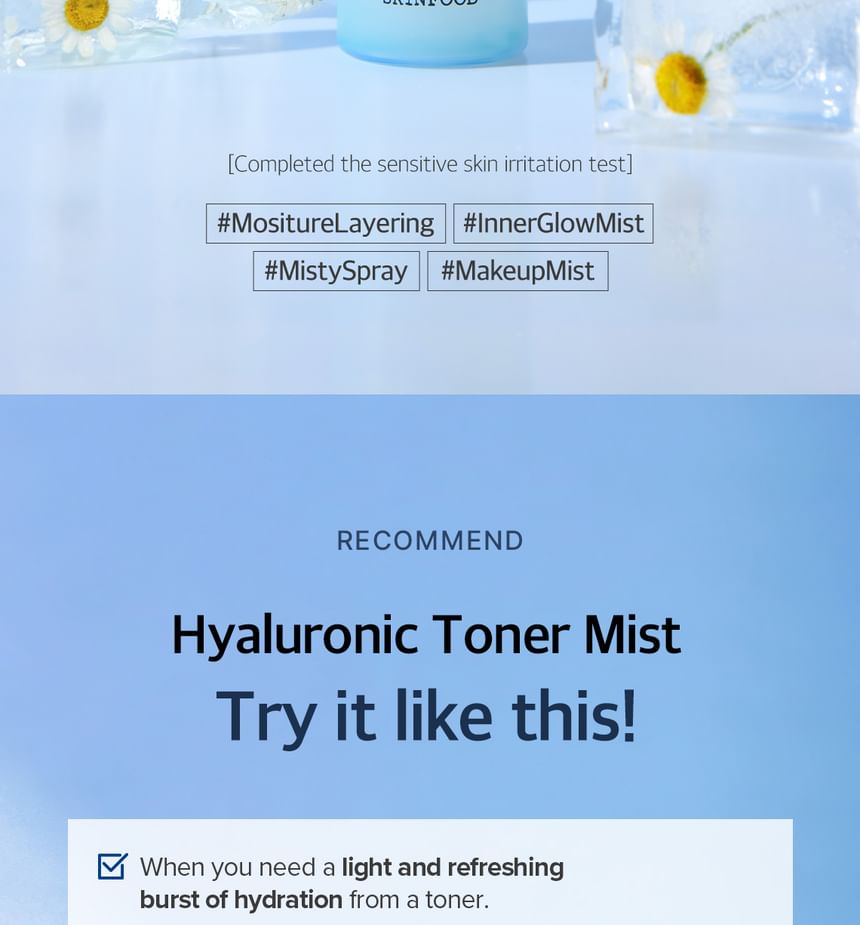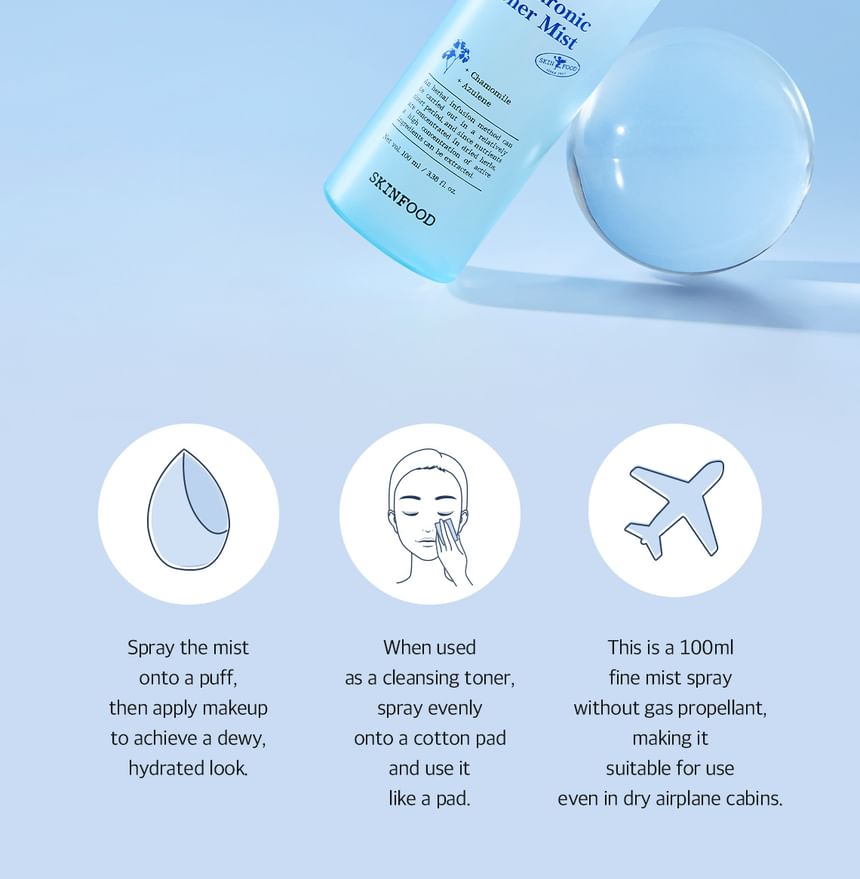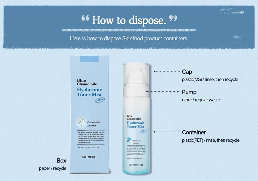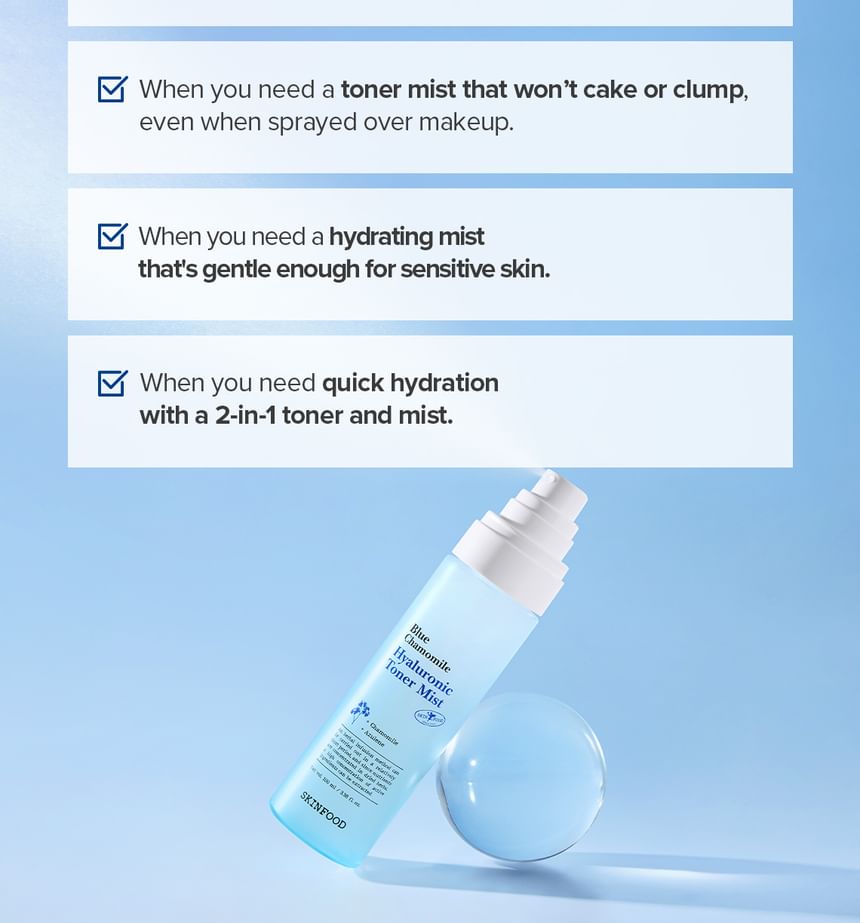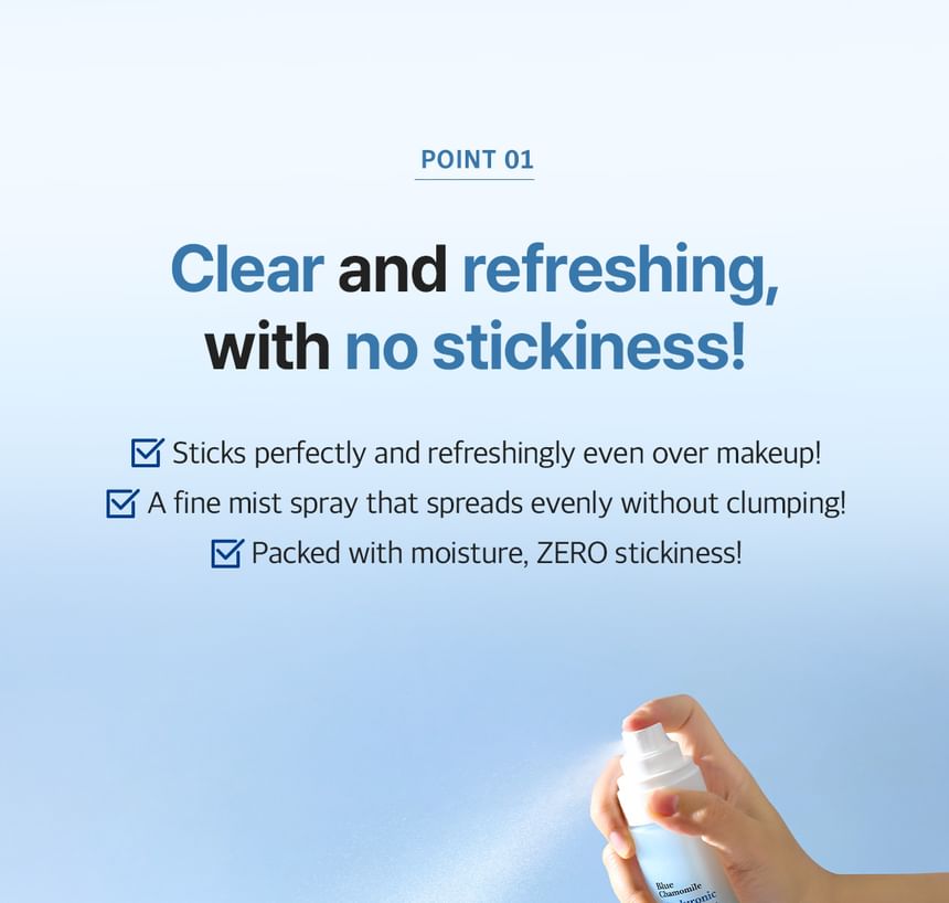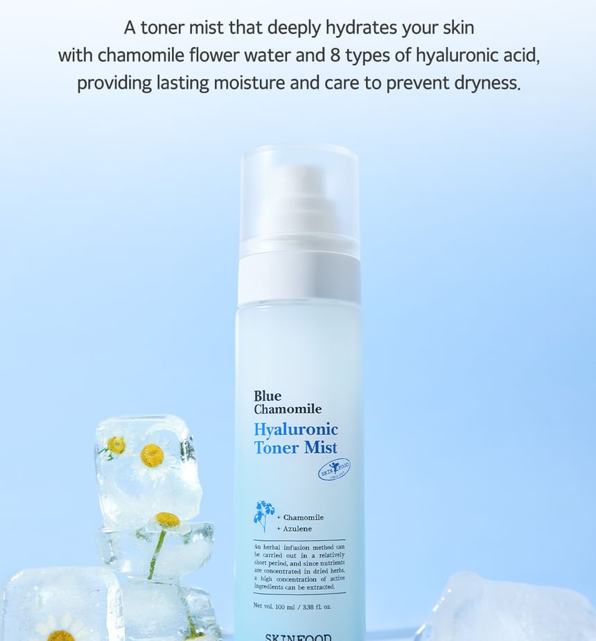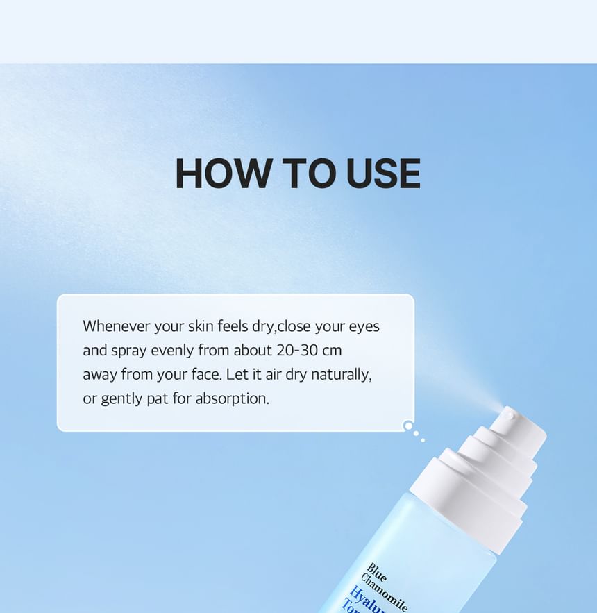A toner mist enriched with Blue Chamomile and 8 types of Hyaluronic Acid, providing deep hydration without leaving any sticky residue on the skin.