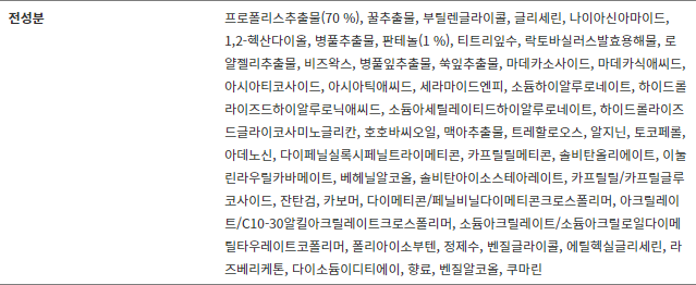 Состав: Экстракт прополиса (70%), Экстракт мёда, Бутиленгликоль, Глицерин, Ниацинамид, 1,2-гександиол, Экстракт центеллы азиатской, Пантенол (1%), Гидролат листьев чайного дерева, Ферментированный Лизат лактобактерий, Экстракт Маточного Молочка, Пчелиный воск, Экстракт листьев центеллы азиатской, Экстракт листьев полыни, Мадекассосид, Мадекассовая кислота, Азиатикозид, Азиатиковая кислота, Керамид NP, Гиалуронат натрия, Гидролизированная Гиалуроновая Кислота, Ацетилированный гиалуронат натрия, Гидролизат глюкоминогликанов, Масло семян жожоба, Солодовый экстракт, Трегалоза, Аргинин, Токоферол, Аденозин, Дифенилсилоксифенилтриметикон, Каприлил метикон, Сорбитан оливат, Карбамат лаурил инулина, Бегениловый спирт, Сорбитан изостеарат, Каприлил/Каприл глюкозид, Ксантановая камедь, Карбомер, Цетеариловый диметикон/винил диметикон кроссполимер, Акрилат / С10-30 алкил акрилатный кроссполимер, Сополимер акрилата/Акрилоилдиметил таурат натрия, Полиизобутен, Вода, Бензил гликоль, Этилгексилглицерин, Кетон малины, Динатрий ЭДТА, Отдушка, Бензиловый спирт, Кумарин